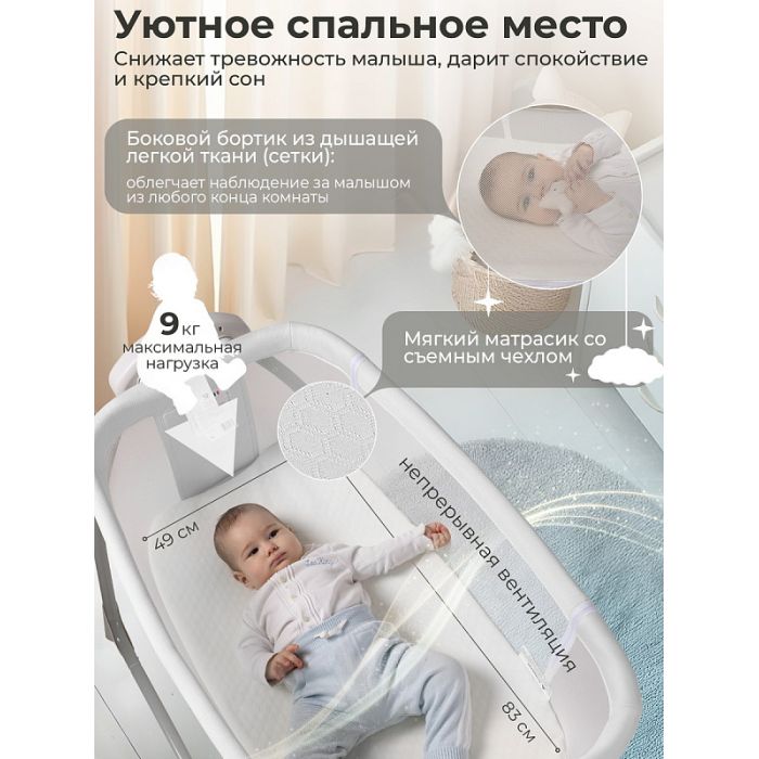 Интеллектуальный блок с дисплеем: Уникальная система электронного укачивания позволяет регулировать скорость качания, чтобы ваш малыш всегда чувствовал себя уютно и спокойно. Функцию раскачивания можно легко отключить, когда это необходимо.