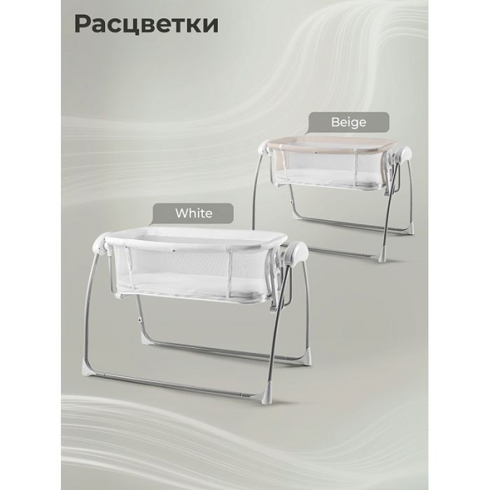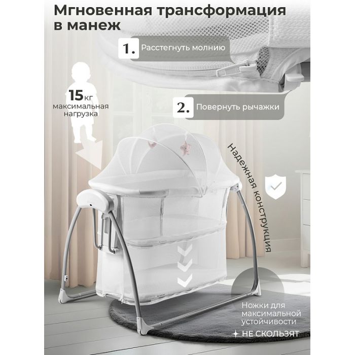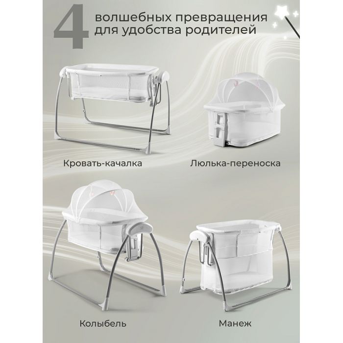Богатая комплектация: в комплект входят: пульт ДУ, адаптер, москитная сетка, подвесные игрушки, мягкий матрасик из хлопка, электронный блок управления.
