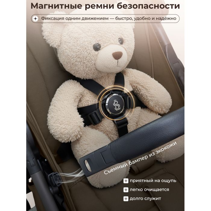 Широкое и комфортное сиденье обеспечит вашему ребенку удобство даже в комбинезоне. Магнитные ремни безопасности добавляют удобства родителям. Большое спальное место позволит малышу чувствовать себя уютно в поездке.