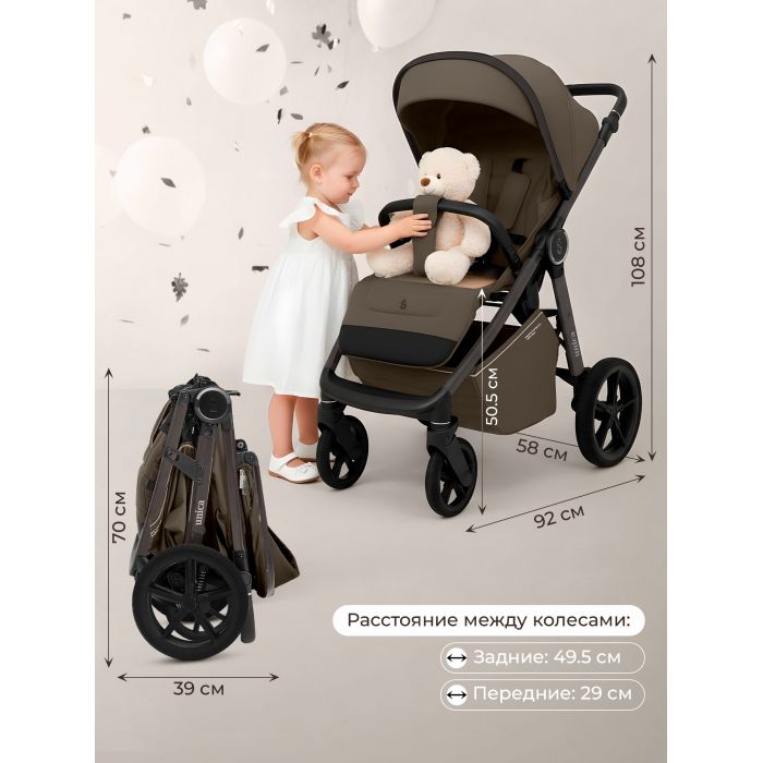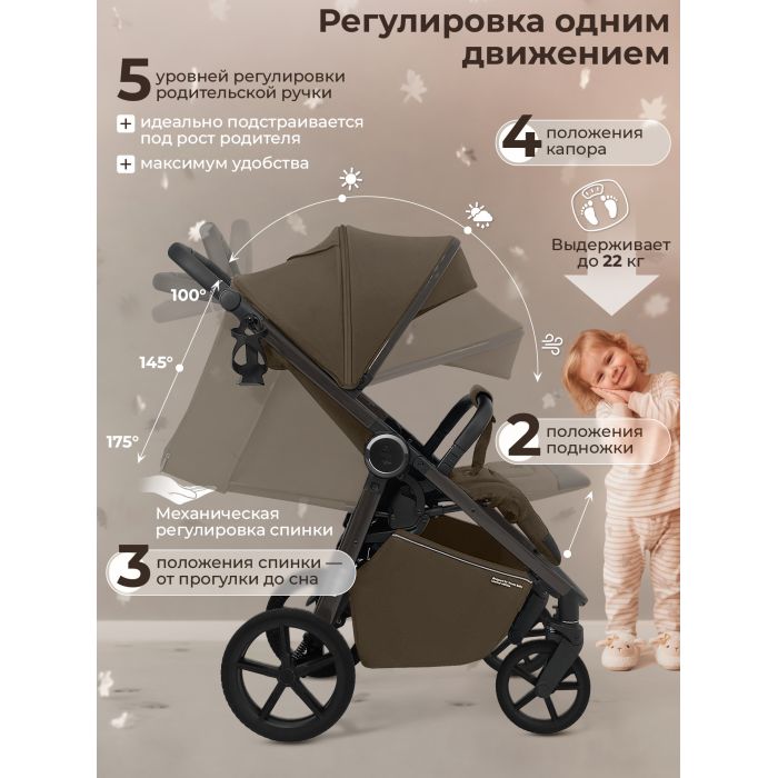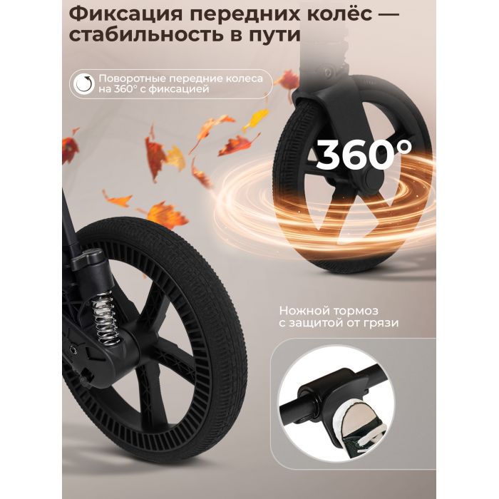 Новые интонационные колеса из высокомолекулярного сшитого полимера с регулируемой подвеской обеспечивают мягкую и комфортную прогулку как в городе, так и на природе. Передние колеса поворотные с функцией фиксации обеспечат отличную маневренность.