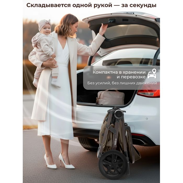 Система складывания одной рукой делает использование коляски еще более удобным. В собранном виде она устойчиво стоит без опоры, не пачкая обивку и ручку.