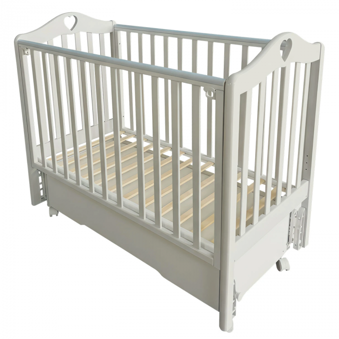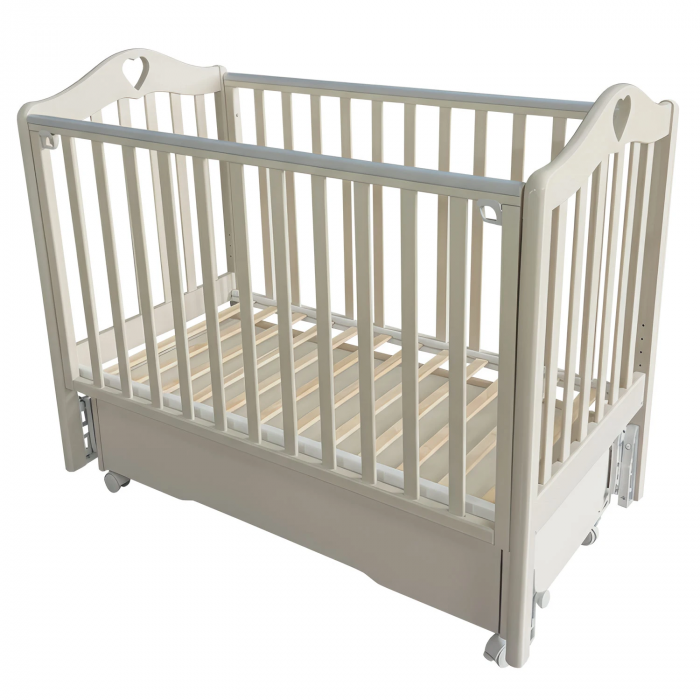 Модель оснащена универсальным маятниковым механизмом с продольным и поперечным качанием и колесами для удобного перемещения. Передняя стенка съемная, с механизмом автоматического опускания, что позволяет использовать кроватку в дальнейшем как диванчик. Реечное ортопедическое ложе имеет три уровня регулировки по высоте и подходит под стандартный размер матраса. В нижней части расположен закрытый выдвижной ящик для хранения детских принадлежностей.