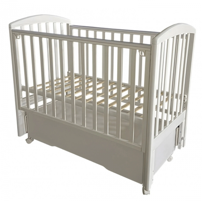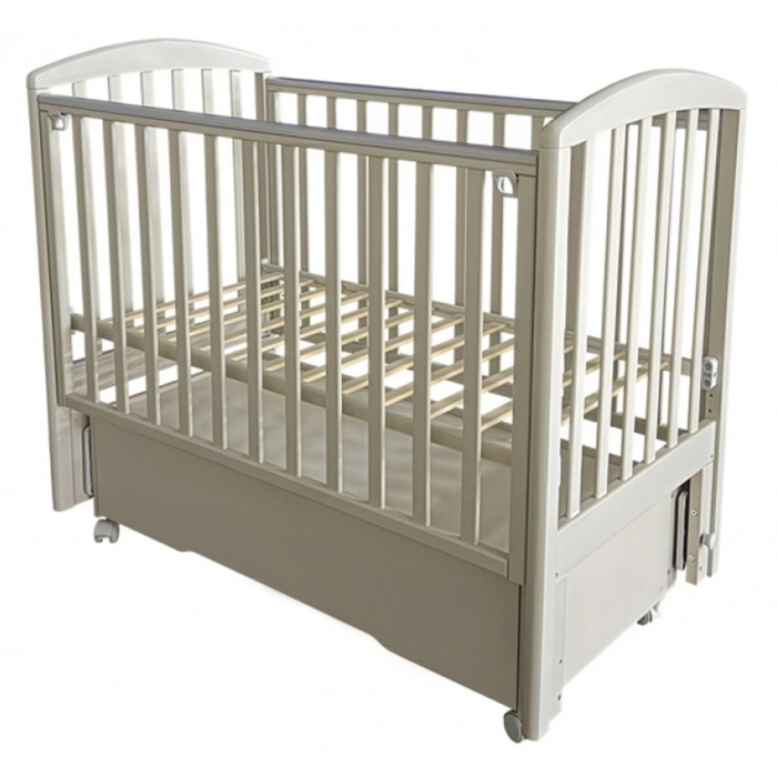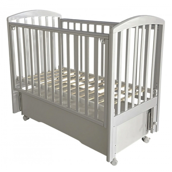 Кроватка оснащена универсальным маятниковым механизмом с продольным и поперечным качанием, а также колесами для удобного перемещения. Съемная передняя стенка с механизмом “автостенка” облегчает доступ к ребенку. Реечное ортопедическое ложе регулируется по высоте в трех положениях, что позволяет использовать кроватку на протяжении взросления малыша.