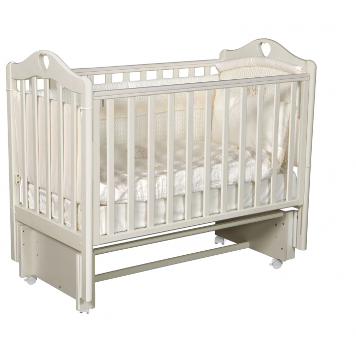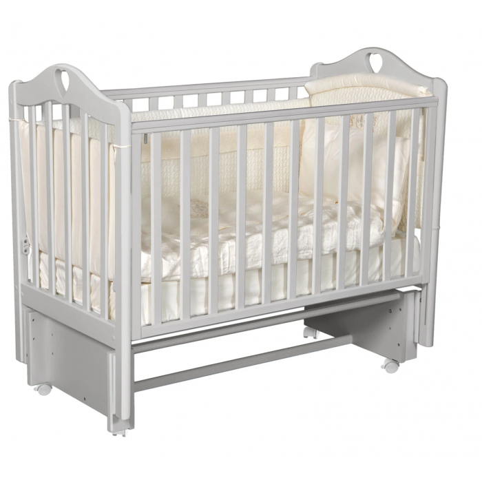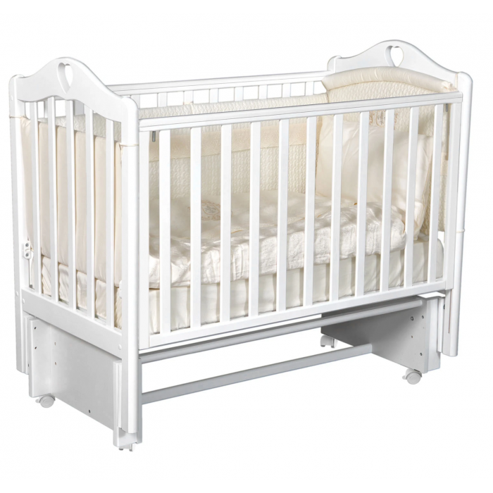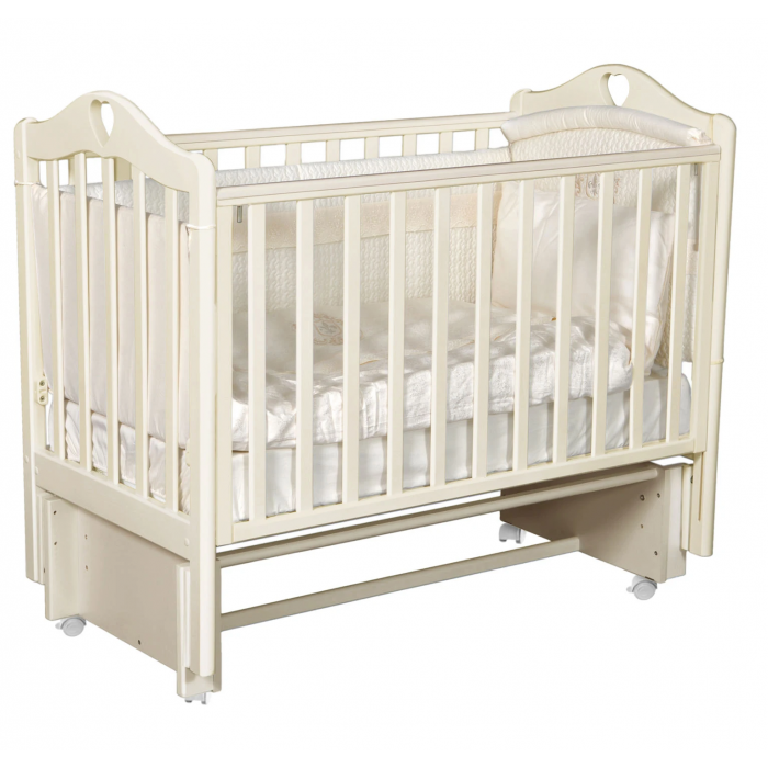 Модель оснащена универсальным маятниковым механизмом с возможностью продольного и поперечного качания, а также колесами для удобного перемещения. Передняя стенка съемная, с механизмом автоматического опускания. В дальнейшем кроватку можно использовать как диванчик, предварительно сняв переднее ограждение. Реечное ортопедическое ложе имеет три уровня регулировки по высоте и рассчитано под стандартный размер матраса.