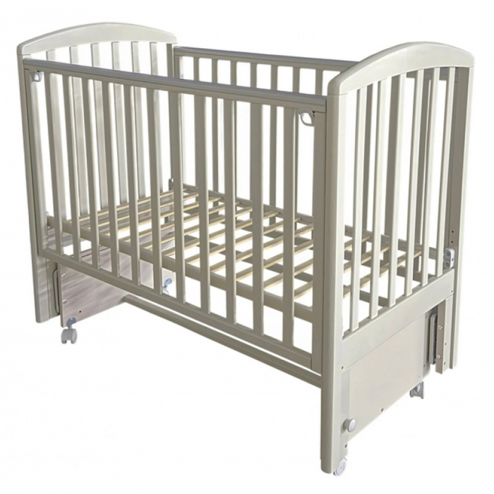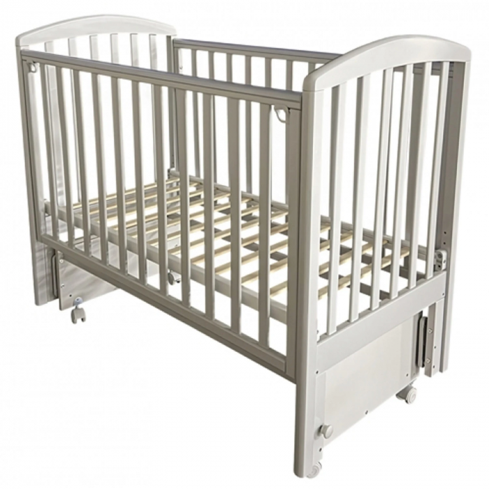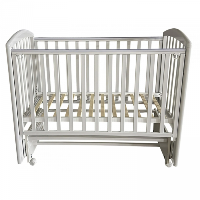 Кроватка оснащена универсальным маятниковым механизмом с возможностью продольного и поперечного качания, а также колесами для удобного перемещения. Съемная передняя стенка с механизмом автостенки упрощает уход за ребенком. Реечное ортопедическое ложе регулируется по высоте, что позволяет адаптировать кровать под растущего ребенка.