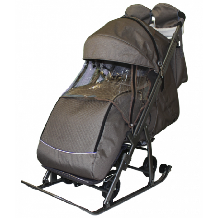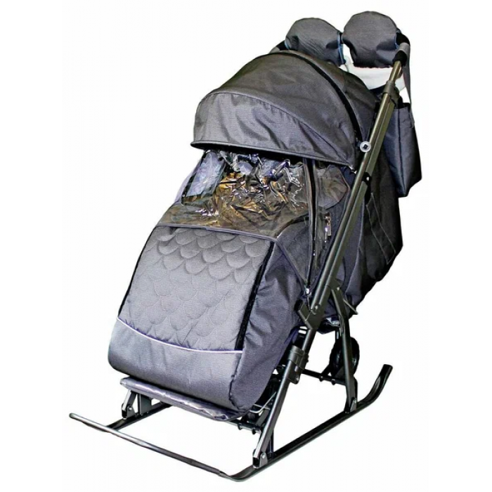 Полозья и колеса: Санки оснащены системой смены полозьев на выдвижные колеса, что делает их удобными как на заснеженной тропе, так и на асфальте.