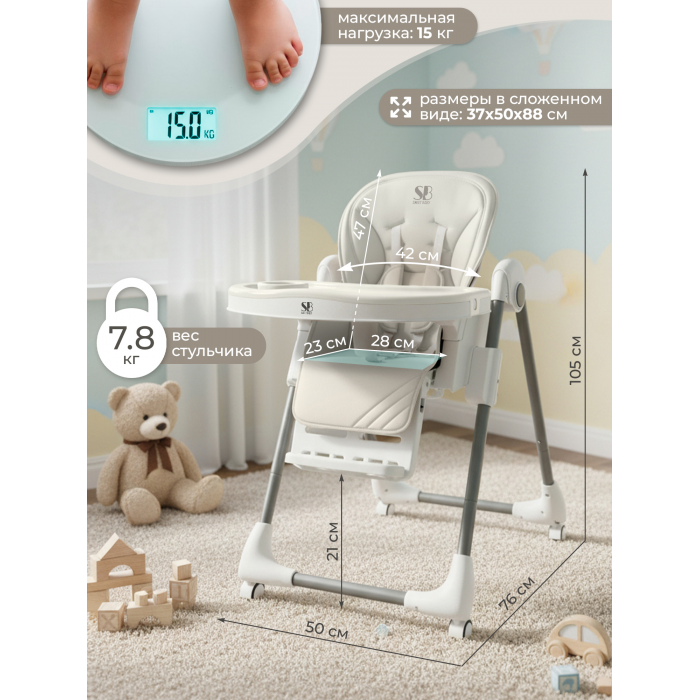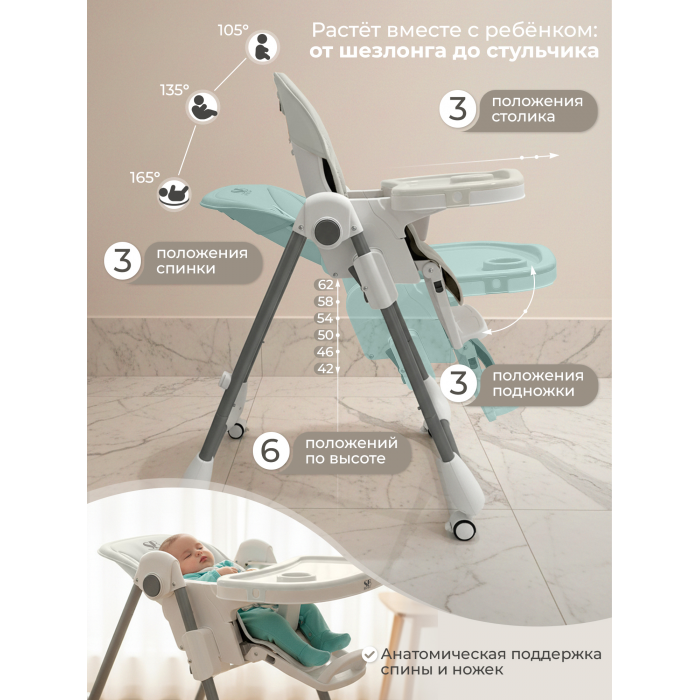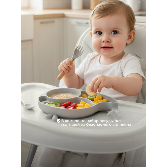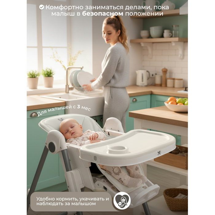Безопасность всегда на первом месте. Ремни безопасности с мягкими накладками обеспечат защиту и комфорт вашему ребёнку, а поворотные колеса сделают перемещения по кухне или другим помещениям легкими и удобными.